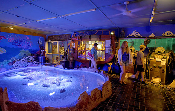 Your visit here will be a truly immersive experience. Passing through our doors, your first exhibit is our reef pool and its surrounding display of maritime artefacts, including turn of the century pearl diving helmets. From here, the aquarium arcade awaits, with a vibrant display featuring over 100 species of colourful fish and crustaceans. Follow the path into our jungle gardens, where authentic tribal art is displayed amongst the greenery and in museum rooms, it’s also home to our crocodile and sea turtle ponds which you can visit all day. Finally, our gift shop with its treasure chests full of beautiful jewelry made with gemstones, amber and shells, as well collectibles, corals, artwork, genuine crocodile teeth, merchandise, souvenirs and much more. We’re open 7 days a week, 9am to 4pm.